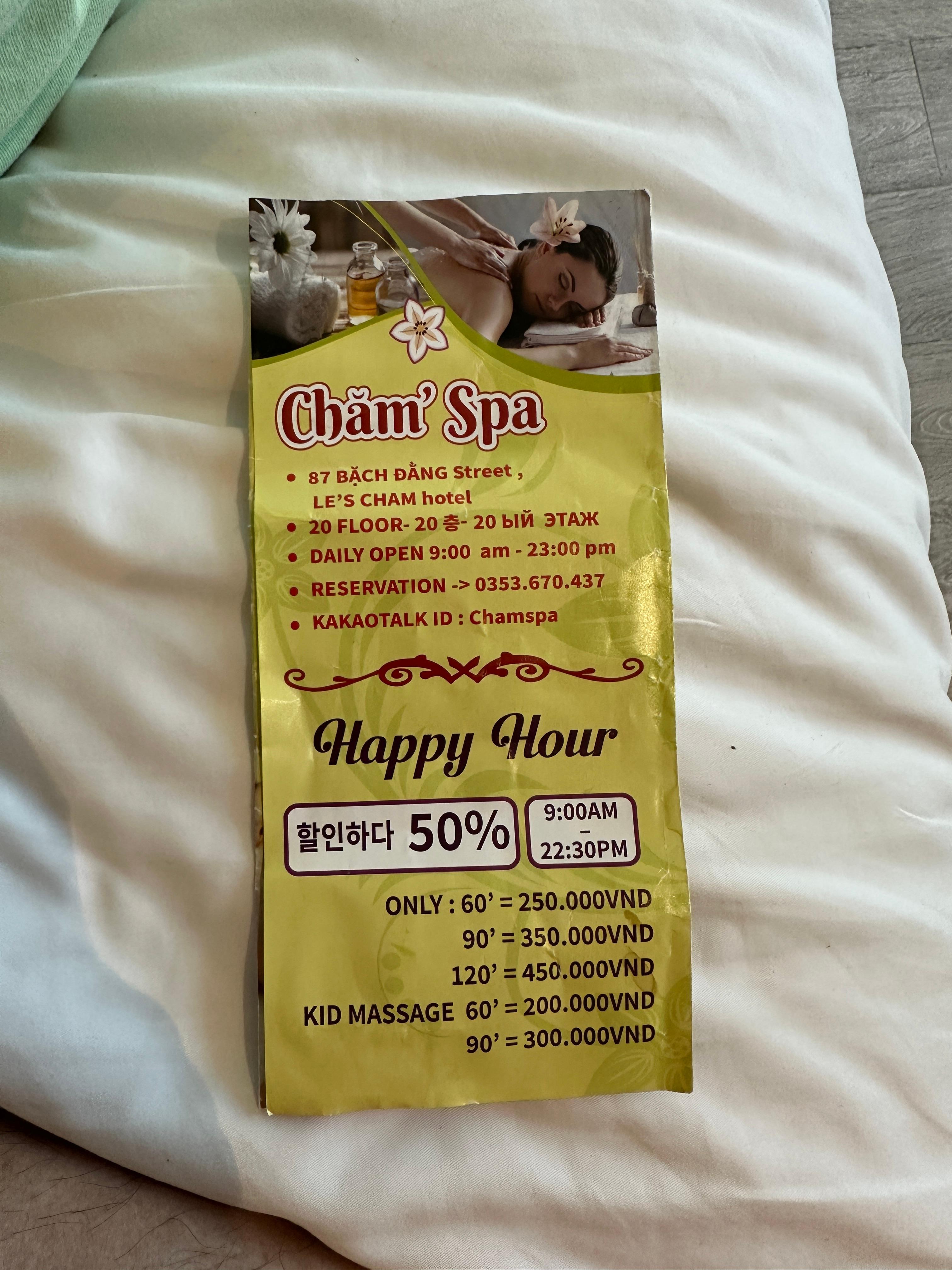 0.5박 숙소로 묻었던 레스참(Les Cham)호텔 스파에 가서 마사지한 후기입니다. 일단 해피아워 시간에 너무 저렴하게 마사지를 한다고 해서 진짜 인가 했어요. 결론 부터 말하면 가격 대비 매우 괜찮았어요. ㅎㅎ